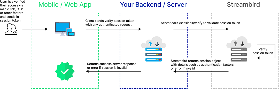 To take advantage of our session management, we recommend that you store this token on client-side in localStorage or cookie verify this token for every sensitive action. For example, you should implement within your middleware or an endpoint on your backend/server-side to call our API to verify this session token whenever an action requires authorization check to ensure that this session is valid and not deleted.
