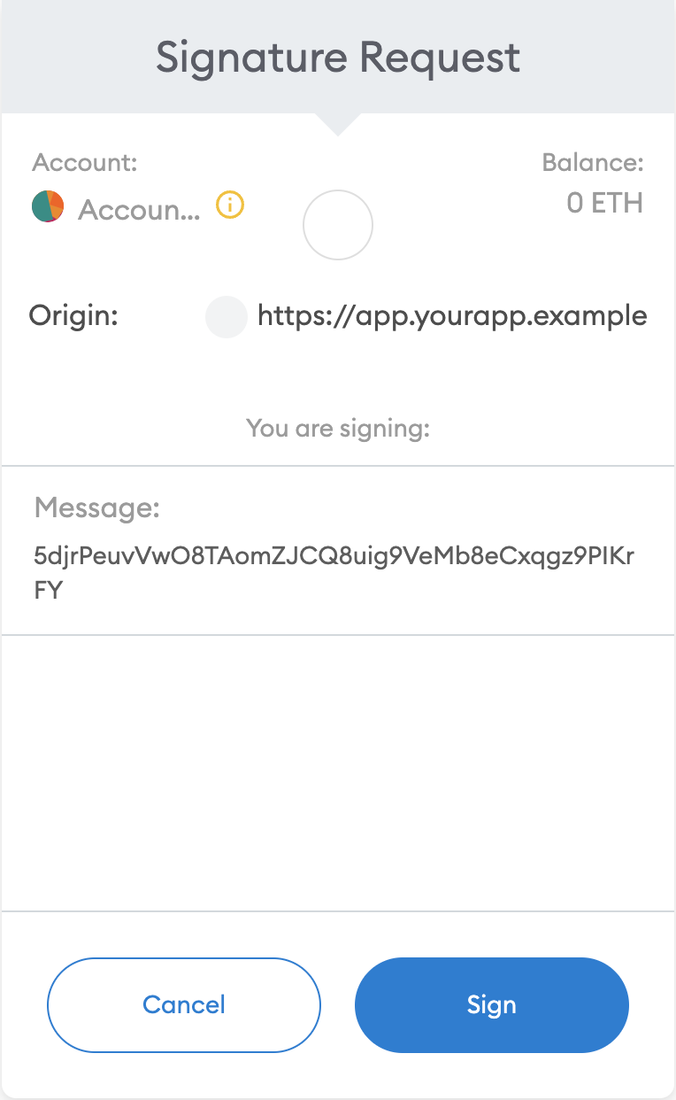 mycrypto.com to easily trigger a MetaMask signing of your challenge here, choose MetaMask, then paste in the challenge. Once signed by MetaMask, use the sig field in the JSON to continue with this tutorial. For your convenience, you can also use our live codeblock below and simply replace the message with your own challenge message.Full Live Example of Login to MetaMask with Message Signing
