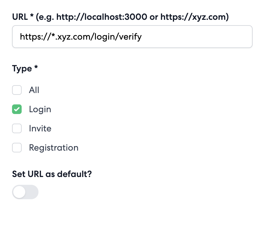 To support multi-tenant or multi-service applications that might have different subdomains but might not know ahead of time the exact subdomain to be used, Streambird allows wildcard subdomain whitelisting. For example, if you intend to create a wildcard redirect URL for any subdomain underxyz.com, you can create a redirect URL https://*.xyz.com/login/verify. This will allow any subdomain of xyz.com like https://custom.xyz.com to be considered a valid redirect URL when initiating authentication requests.